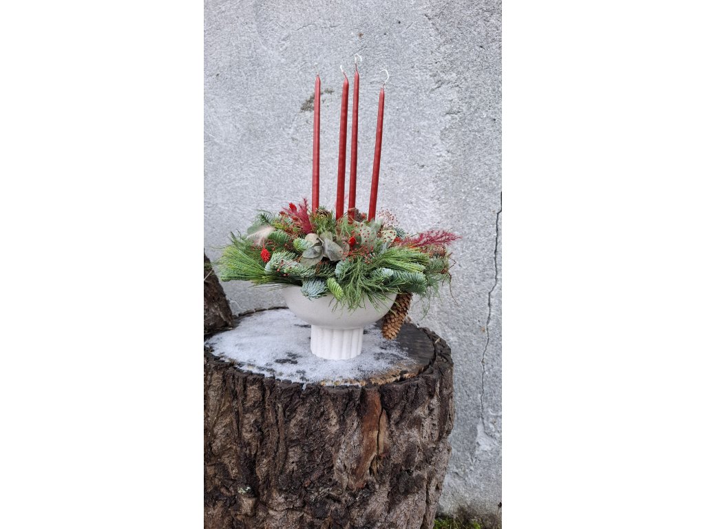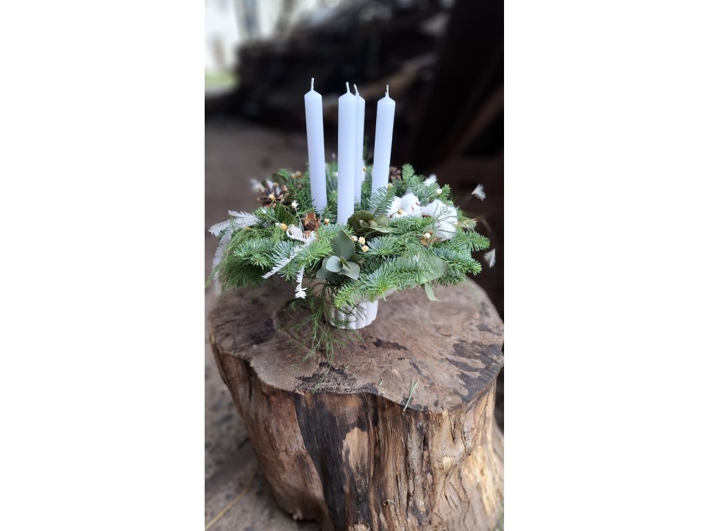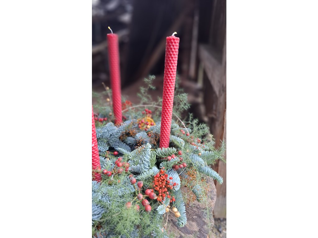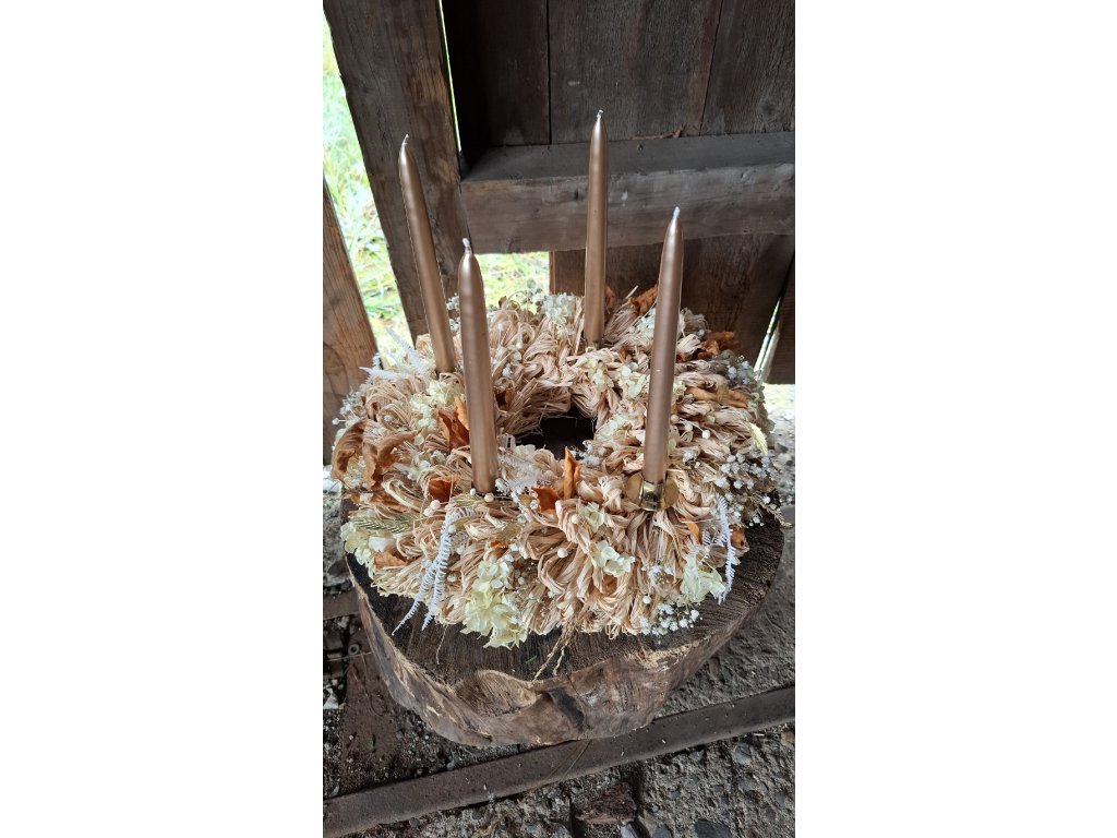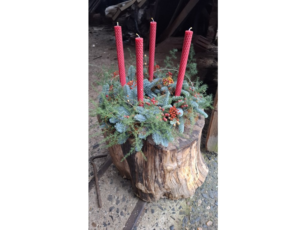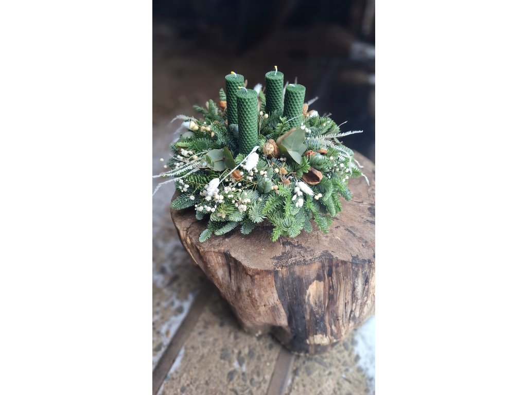 Adventní věnec z živé přírody, plný vůně jedle Nobilis, chvojí, sušených květů, šišek a drobných větviček.