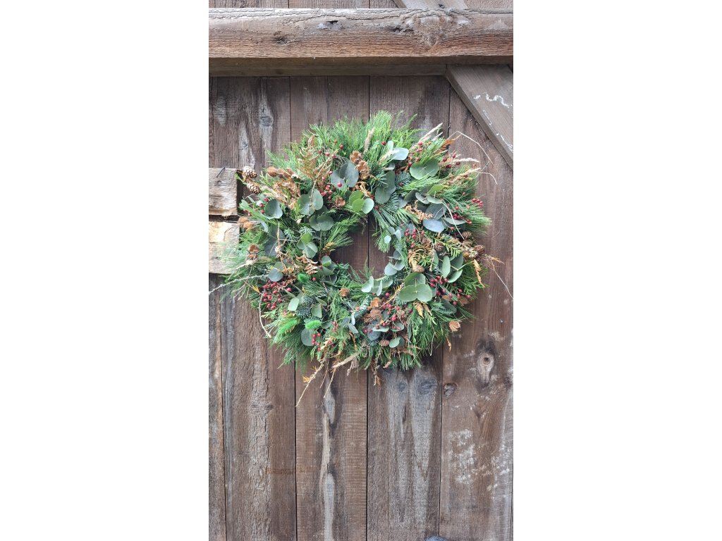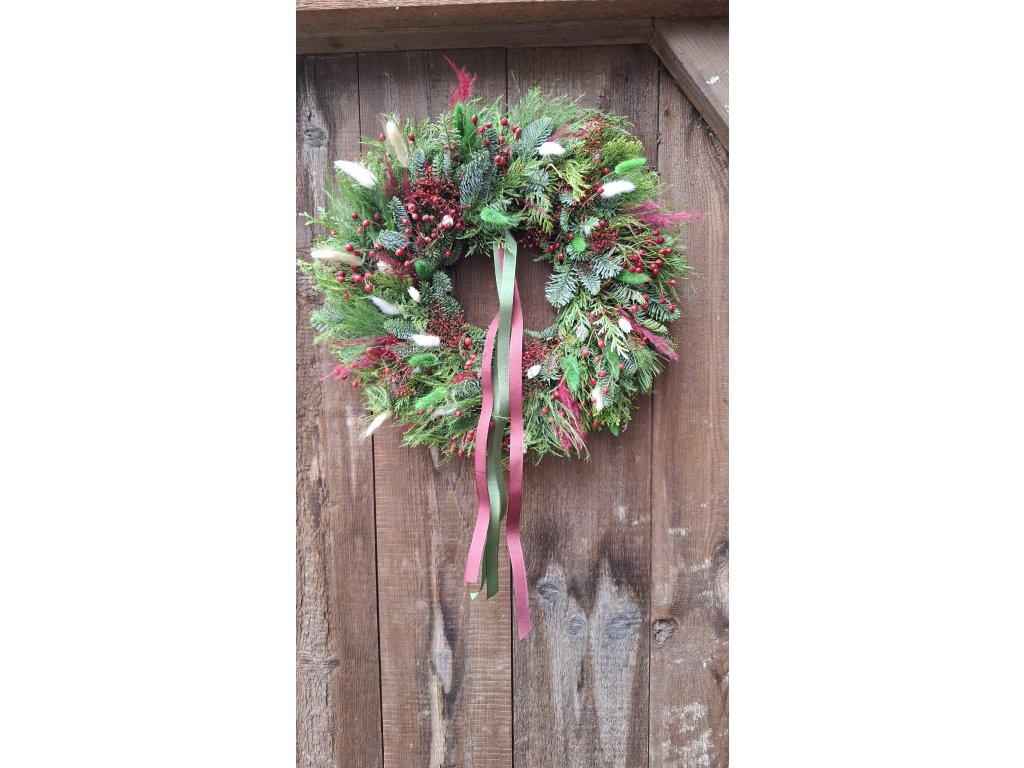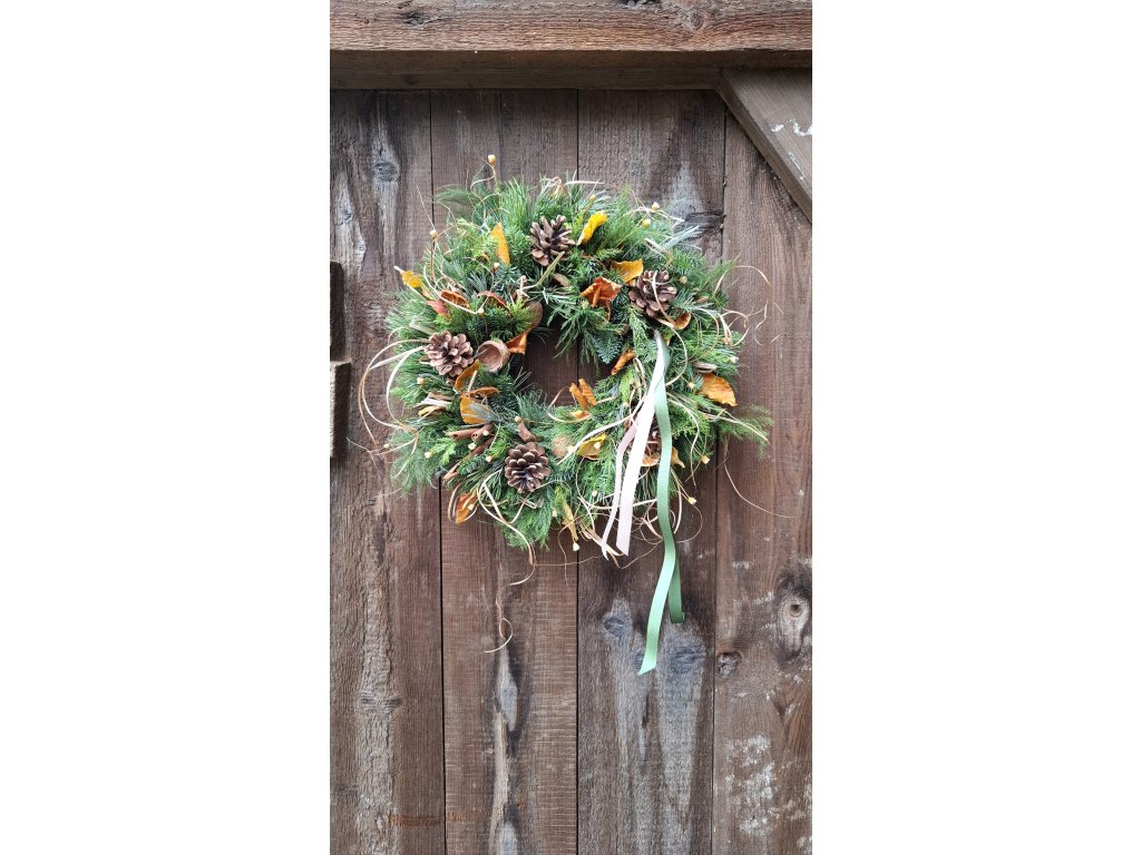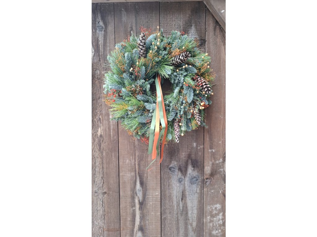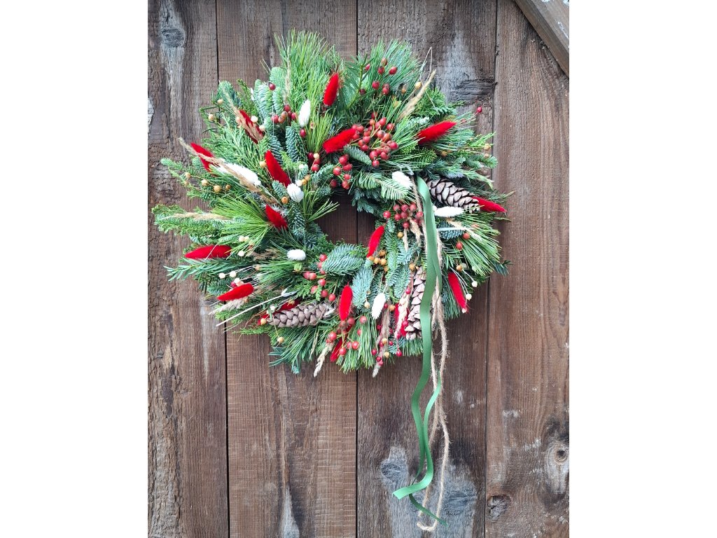 Ručně vázaný věnec na dveře z čerstvé jedle Nobilis, doplněný chvojím, šiškami a sušenými květinami.